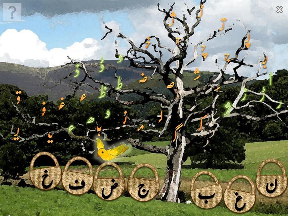 One fine day, a lively tree full of bright and juicy Urdu letters is tragically struck by lightning from a lone cloud... and all the 'ripe' (orange) letters are split in half, thus forming 'Aadhi Ashkaal' or short forms of Urdu letters..!